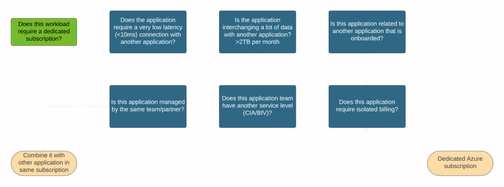 Isolating resources in different subscriptions should not be a goal on its own. However, it does offer the possibility to create a foundation for governance. When we work with a customer, we typically use the decision tree, as shown below, to determine when a new subscription should be deployed for an application.